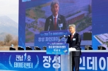 Chairman Jung Won-ju of Daewoo E&C delivers a commemorative speech at a groundbreaking ceremony for the Jangseong Fine Datacenter at the publicity pavilion at the Gwangju Research Development Special Zone in Nam-myeon, Jangseong-gun, Jeollanam-do¡¦