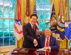 Chmn. Lee Jay-hyun of CJ Group, a member of an economic delegation who accompanied President Lee Jae-myung on a Korea-U.S. summit, poses with other delegates prior to the ¡°Korea-U.S. Business Roundtable¡± at Willard InterContinental Washington in Wa¡¦