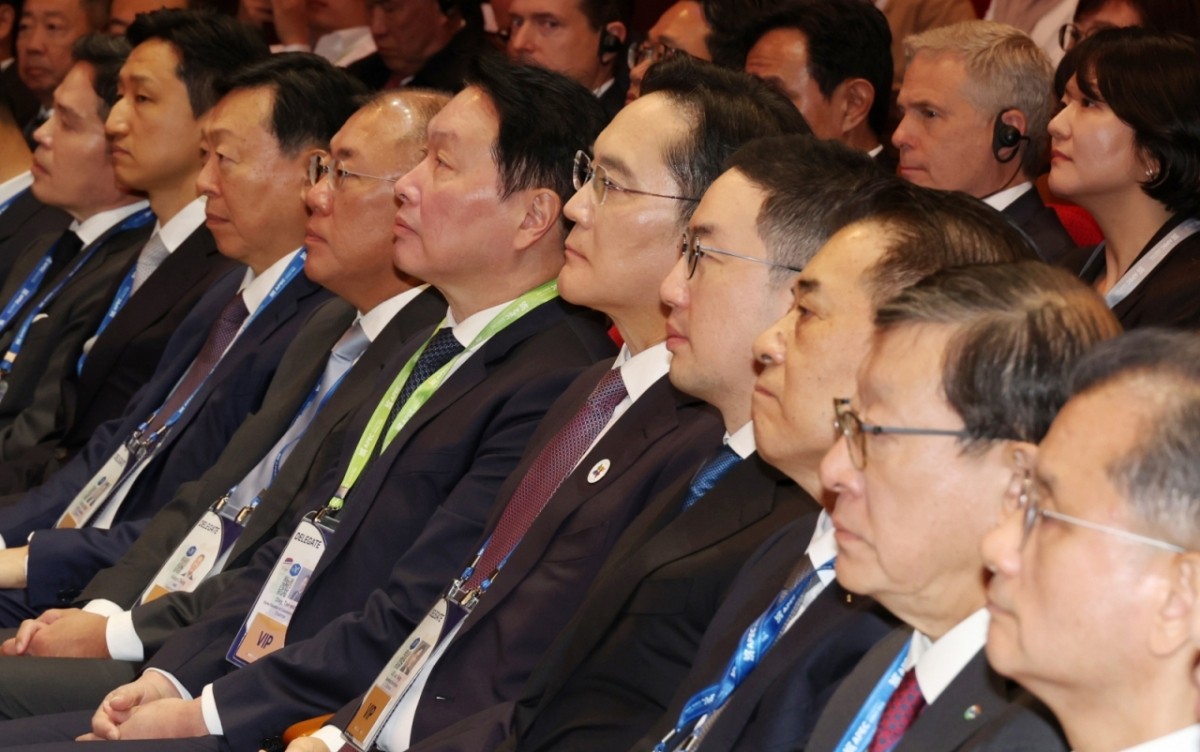 Korean business leaders listen to a special speech President Lee Jae-myung gives at the APEC CEO Summit at Gyeongju Arts Center on Oct. 29. Seen (from left) are Shinsaegae Group Chmn. Chung Yong-jin, HD Hyundai Group Chmn. Chung Ki-sun, Lotte Group Chmn. Shin Dong-bin, Hyundai Motor Group Chmn. Chung Eui-sung, SK Group Chmn. Chey Tae-won, concurrently KCCI chairman, Samsung Electronics Chmn. Lee Jay-yong, LG Group Chmn. Koo Kwang-mo, POSCO Holdings Chmn. Jang In-hwa, GS Chmn. Huh Tae-soo and Hanwha Group Vice Chmn. Kim Dong-kwan.