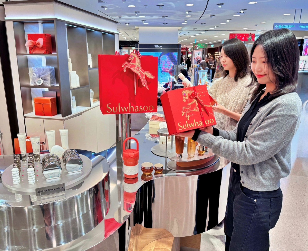 Customers at the Sulhwasoo outlet of Lotte Department Myeongdong Main Store look at freebees designed to promote the cosmetics brand as part of the ¡°2026 New Year¡¯s regular discount,¡± which was conducted from Jan. 2 to Jan. 18. (Photo: Lotte Department)