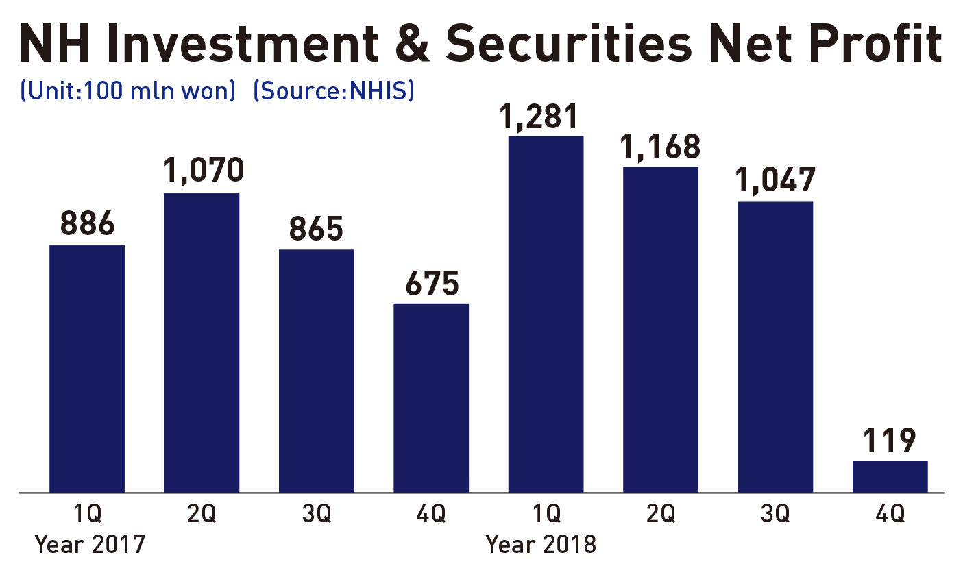 NHIS, in fact, achieved the best annual results in 2018 with its investment banking sector leading the way. Its operating profit rose 17.6 percent YoY at 540.1 billion won and net profit up 3.4 percent YoY at 361.4 billion won, both setting the records as the largest in its history, although its sales at 9.241,3 fell 3.2 percent YoY.