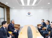 Minister Kim Yun-duk of the Minstery of Land, Infrastructure and Transport (MOLIT) meets with Daewoo E&C Chmn. Jung Won-ju to discuss matters related to the site preparation work of the Gadeok Island new airport construction project at Seoul Nati¡¦