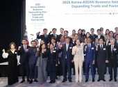 Chairman & CEO Choi Jin-shik of the Federation of Middle Market Enterprises of Korea (FOMEK), Minister for Trade Yeo Han-koo and Malaysian Amb. to Korea Dato' Mohd Zamruni bin Khalid pose with other attendees at speaking at ¡°2025 MME Internation¡¦