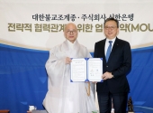 Shinhan Bank President Jeong Sang-hyeok and Venerable Jin-woo pose for a photo during a partnership ceremony between Shinhan Bank and the Chogye Order on March 11. (Photo: Shinhan Bank) On Mar. 11, Shinhan Bank signed a business agreement with t¡¦