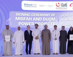 Korea Western Power President Lee Jeong-bok, Sheikha Hind Suhail Bahwan, chair of Hind Bahwan Group, and Ahmed bin Salim Al Abri, president of Nama Power and Water Procurement Company attend a contract signing ceremony for the Oman Duqm Combined Cycl¡¦