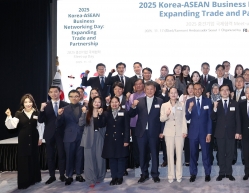 Chairman & CEO Choi Jin-shik of the Federation of Middle Market Enterprises of Korea (FOMEK), Minister for Trade Yeo Han-koo and Malaysian Amb. to Korea Dato' Mohd Zamruni bin Khalid pose with other attendees at speaking at ¡°2025 MME Internation¡¦