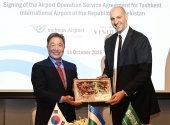President Lee Hag-jae of Incheon International Airport Corp. (IIAC) poses with President Omar N. Al-Midani of Vision Invest after they struck a contract on the operational service of Tashkent Airport in Uzbekistan on Oct. 14. (Photos: IIAC)Incheon In¡¦