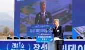 Chairman Jung Won-ju of Daewoo E&C delivers a commemorative speech at a groundbreaking ceremony for the Jangseong Fine Datacenter at the publicity pavilion at the Gwangju Research Development Special Zone in Nam-myeon, Jangseong-gun, Jeollanam-do¡¦